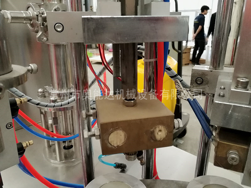 該機的灌裝、封口、壓齒、換位、定位等均采用機電、光電、氣泵一體化原理,通過凸輪分度機構,換位、定位,氣泵灌裝、封口等動作完成,灌裝、加熱、封口、切尾、頂桿等七個工作程序。所有動作均同一輸出同步完成。保證動作一體化,提高了動作的可靠性和穩定性。